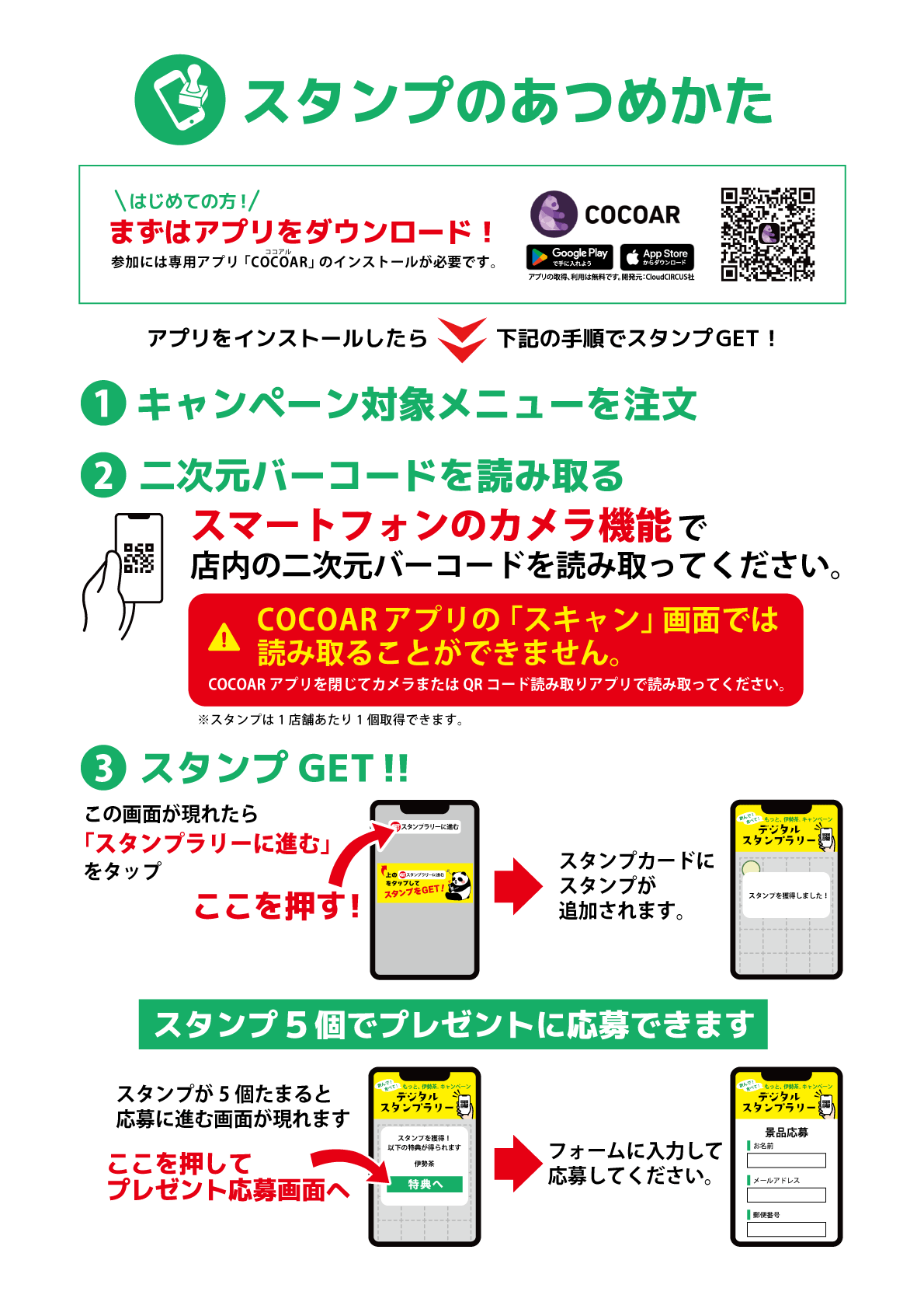 キャンペーン参加店を巡り、スタンプ5個を集めてプレゼントに応募しよう!
